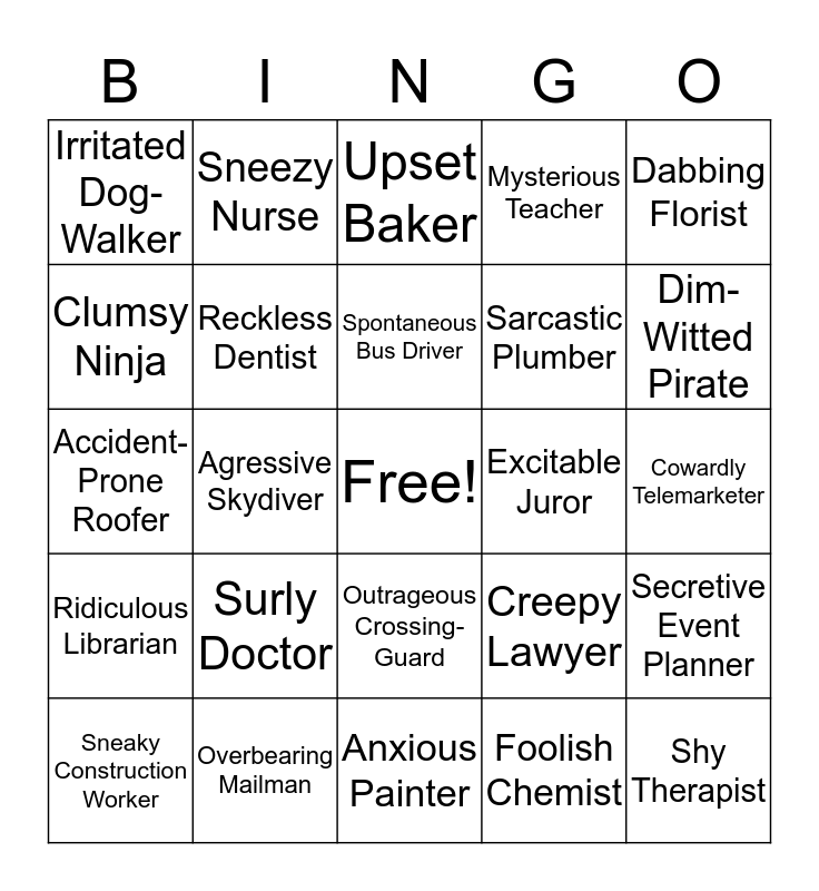 This bingo card has a free space and 24 words: Surly Doctor, Overbearing Mailman, Spontaneous Bus Driver, Sneaky Construction Worker, Dabbing Florist, Irritated Dog-Walker, Clumsy Ninja, Sneezy Nurse, Excitable Juror, Outrageous Crossing-Guard, Sarcastic Plumber, Accident-Prone Roofer, Creepy Lawyer, Secretive Event Planner, Reckless Dentist, Foolish Chemist, Cowardly Telemarketer, Upset Baker, Dim-Witted Pirate, Agressive Skydiver, Shy Therapist, Ridiculous Librarian, Mysterious Teacher and Anxious Painter.