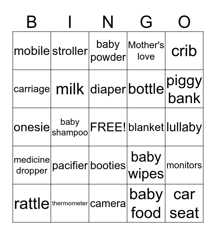 This bingo card has a free space and 24 words: pacifier, thermometer, diaper, rattle, crib, mobile, carriage, stroller, blanket, booties, bottle, onesie, baby wipes, monitors, milk, baby food, lullaby, baby powder, piggy bank, baby shampoo, car seat, medicine dropper, Mother's love and camera.