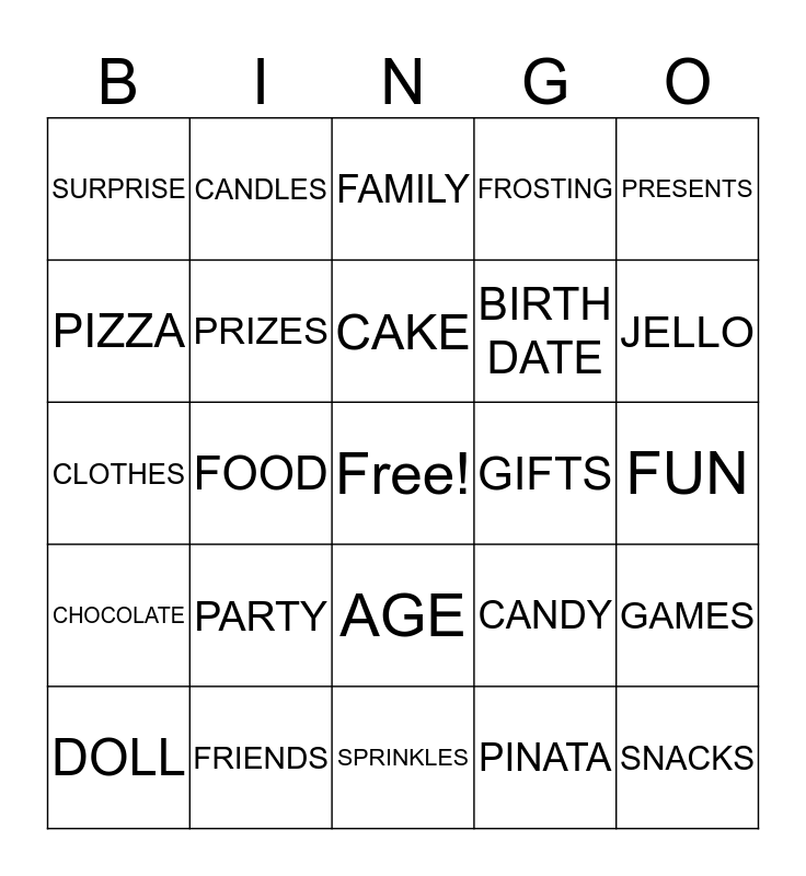 This bingo card has a free space and 24 words: PARTY, FRIENDS, CAKE, DOLL, PRESENTS, SURPRISE, PIZZA, CANDLES, GIFTS, AGE, BIRTH DATE, CLOTHES, CANDY, GAMES, PRIZES, PINATA, FUN, FAMILY, JELLO, FOOD, SNACKS, CHOCOLATE, FROSTING and SPRINKLES.