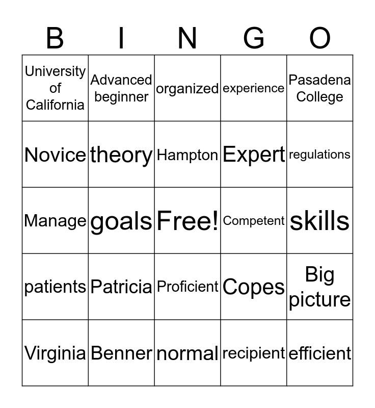 This bingo card has a free space and 24 words: Patricia, Benner, Hampton, Virginia, Pasadena College, University of California, Novice, Advanced beginner, Competent, Proficient, Expert, Manage, Copes, Big picture, theory, recipient, skills, organized, regulations, goals, efficient, patients, experience and normal.
