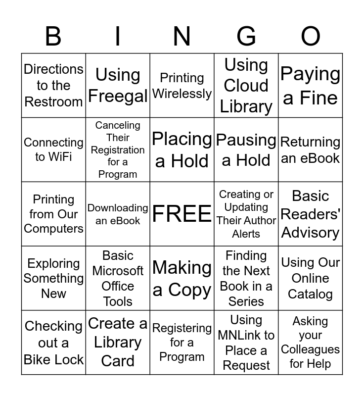 This bingo card has a free space and 24 words: Basic Microsoft Office Tools, Create a Library Card, Placing a Hold, Checking out a Bike Lock, Paying a Fine, Directions to the Restroom, Connecting to WiFi, Using Freegal, Creating or Updating Their Author Alerts, Making a Copy, Pausing a Hold, Printing from Our Computers, Finding the Next Book in a Series, Using Our Online Catalog, Canceling Their Registration for a Program, Using MNLink to Place a Request, Basic Readers' Advisory, Printing Wirelessly, Returning an eBook, Downloading an eBook, Asking your Colleagues for Help, Exploring Something New, Using Cloud Library and Registering for a Program.