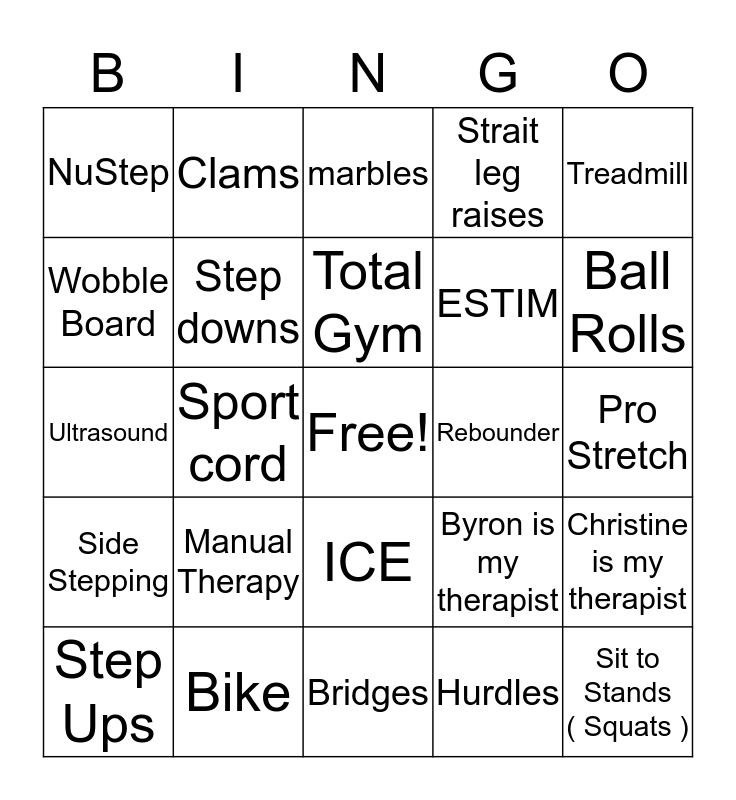 This bingo card has a free space and 24 words: Manual Therapy, Bike, Total Gym, Step Ups, Treadmill, NuStep, Wobble Board, Clams, Rebounder, ICE, ESTIM, Ultrasound, Byron is my therapist, Christine is my therapist, Step downs, Hurdles, Pro Stretch, marbles, Ball Rolls, Sport cord, Sit to Stands ( Squats ), Side Stepping, Strait leg raises and Bridges.