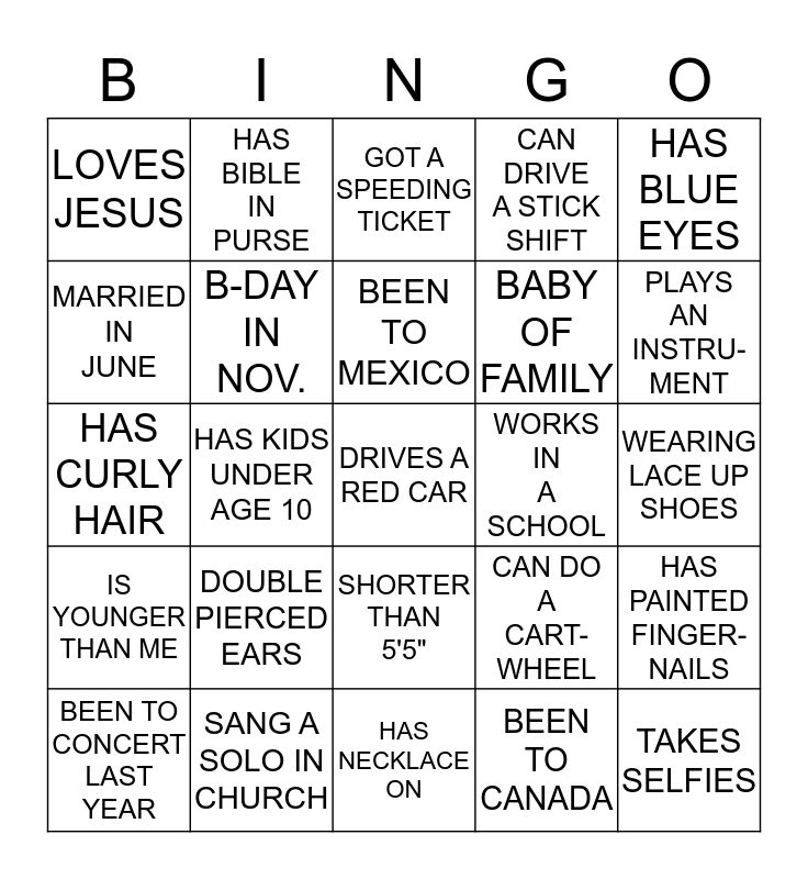 This bingo card has 25 words: DOUBLE PIERCED EARS, HAS NECKLACE ON, BEEN TO MEXICO, BEEN TO CONCERT LAST YEAR, HAS BLUE EYES, LOVES JESUS, MARRIED IN JUNE, HAS BIBLE IN PURSE, WORKS IN A SCHOOL, SHORTER THAN 5'5", BABY OF FAMILY, HAS CURLY HAIR, CAN DO A CART- WHEEL, HAS PAINTED FINGER- NAILS, B-DAY IN NOV., TAKES SELFIES, WEARING LACE UP SHOES, GOT A SPEEDING TICKET, PLAYS AN INSTRU- MENT, HAS KIDS UNDER AGE 10, DRIVES A RED CAR, SANG A SOLO IN CHURCH, IS YOUNGER THAN ME, CAN DRIVE A STICK SHIFT and BEEN TO CANADA.