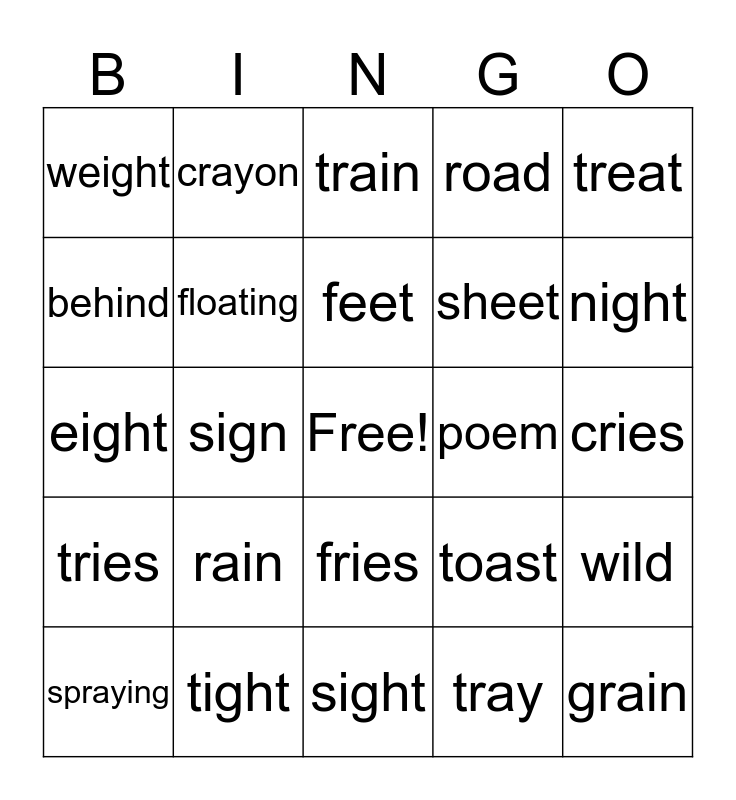 This bingo card has a free space and 24 words: rain, tight, feet, spraying, treat, weight, behind, crayon, poem, fries, sheet, eight, toast, wild, floating, tray, cries, train, night, sign, grain, tries, road and sight.
