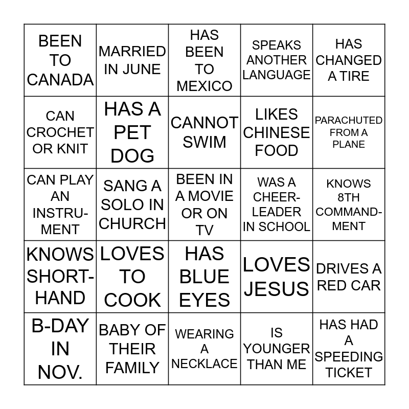 This bingo card has 25 words: LOVES TO COOK, WEARING A NECKLACE, CANNOT SWIM, B-DAY IN NOV., HAS CHANGED A TIRE, BEEN TO CANADA, CAN CROCHET OR KNIT, MARRIED IN JUNE, WAS A CHEER- LEADER IN SCHOOL, HAS BLUE EYES, LIKES CHINESE FOOD, CAN PLAY AN INSTRU- MENT, LOVES JESUS, DRIVES A RED CAR, HAS A PET DOG, HAS HAD A SPEEDING TICKET, KNOWS 8TH COMMAND-MENT, HAS BEEN TO MEXICO, PARACHUTED FROM A PLANE, SANG A SOLO IN CHURCH, BEEN IN A MOVIE OR ON TV, BABY OF THEIR FAMILY, KNOWS SHORT-HAND, SPEAKS ANOTHER LANGUAGE and IS YOUNGER THAN ME.