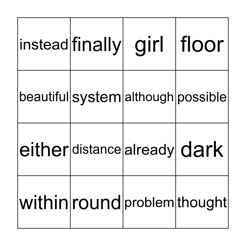 This bingo card has 16 words: round, dark, girl, instead, either, finally, already, problem, beautiful, system, within, floor, distance, possible, although and thought.