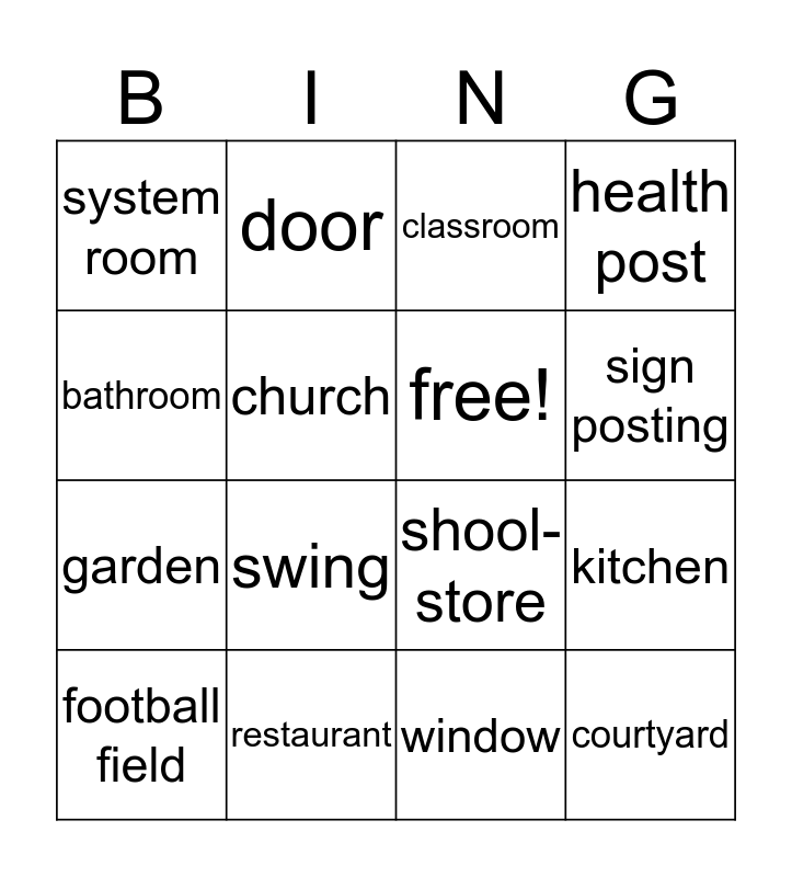 This bingo card has 16 words: restaurant, kitchen, classroom, system room, garden, door, shool-store, window, bathroom, church, football field, health post, swing, sign posting, free! and courtyard.