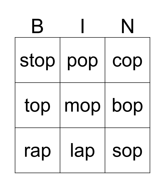 This bingo card has a free space and 8 words: bop, cop, pop, rap, stop, sop, top and lap.