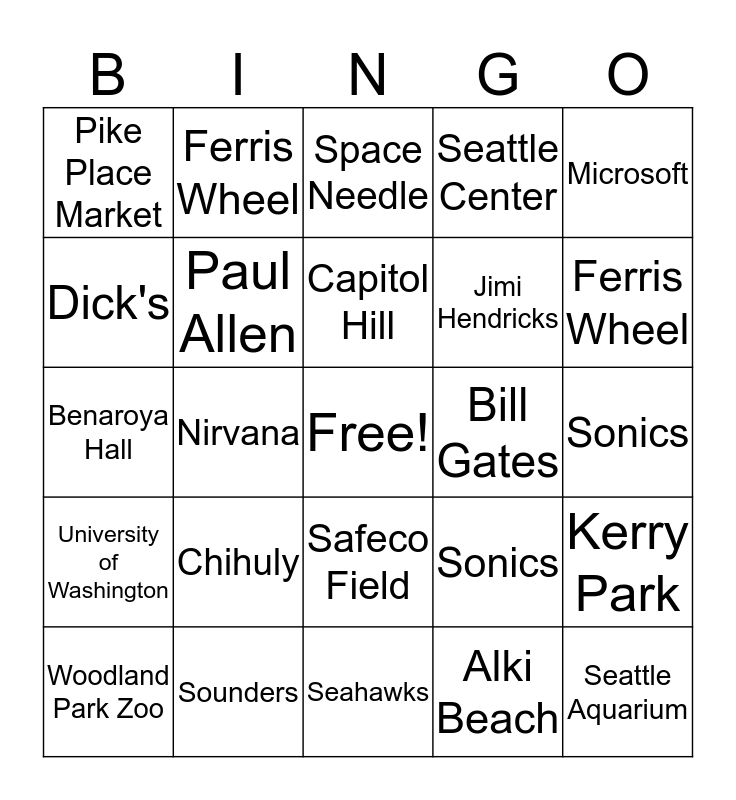 This bingo card has a free space and 30 words: Sounders, Rachel the Pig, Nirvana, Fremont Troll, Pike Place Market, Space Needle, Paul Allen, Safeco Field, Bill Gates, Seahawks, Sonics, Seattle Aquarium, Alki Beach, Macklemore, Ferris Wheel, Pacific Science Center, Sonics, University of Washington, Chihuly, Microsoft, Benaroya Hall, Mariners, Ferris Wheel, Jimi Hendricks, Dick's, Seattle Center, Kerry Park, Woodland Park Zoo, Capitol Hill and EMP.