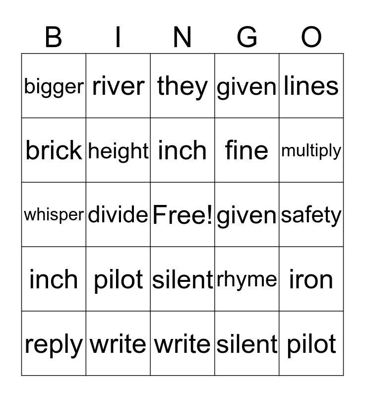 This bingo card has a free space and 25 words: pilot, write, inch, reply, lines, bigger, brick, river, given, silent, fine, whisper, rhyme, iron, height, grade, safety, they, multiply, divide, pilot, write, inch, given and silent.