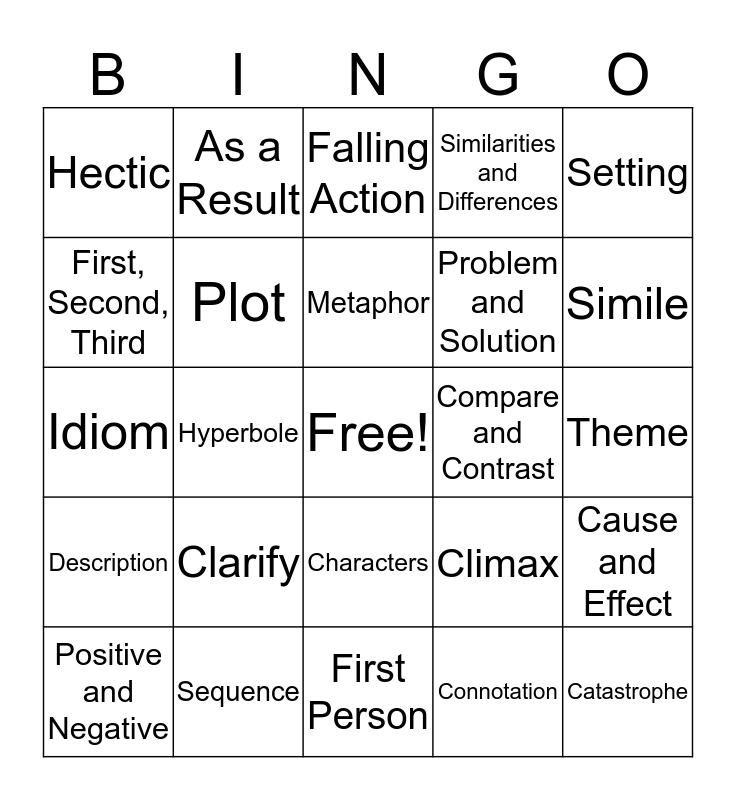 This bingo card has a free space and 24 words: Clarify, Sequence, Metaphor, Positive and Negative, Setting, Hectic, First, Second, Third, As a Result, Compare and Contrast, Characters, Problem and Solution, Idiom, Climax, Cause and Effect, Plot, Connotation, Theme, Falling Action, Simile, Hyperbole, Catastrophe, Description, Similarities and Differences and First Person.