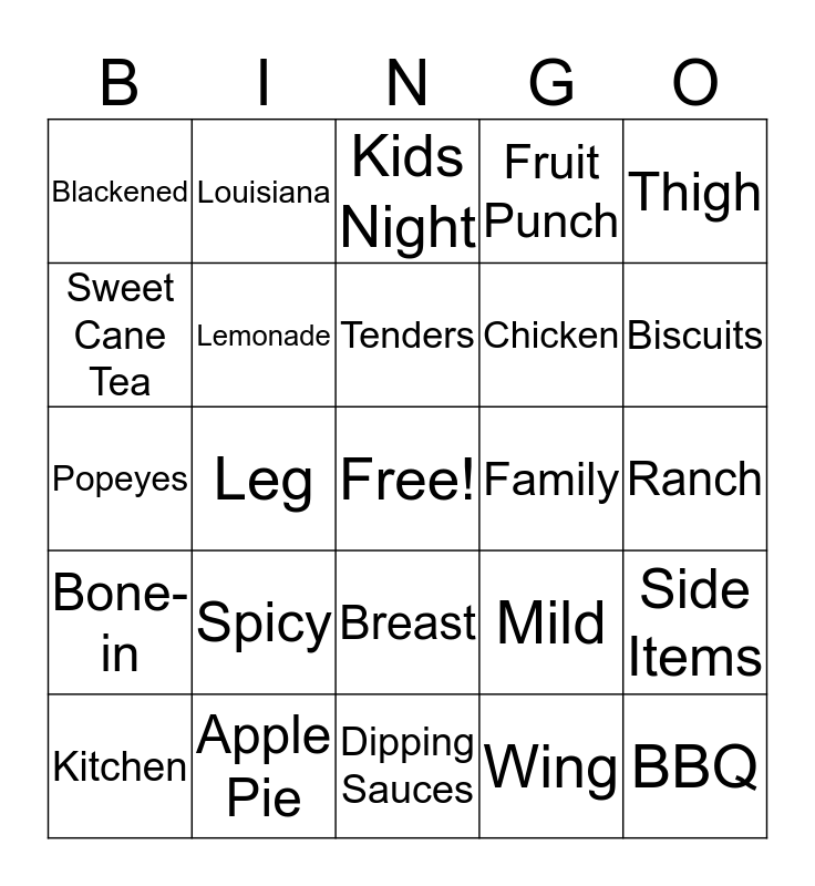 This bingo card has a free space and 24 words: Spicy, Apple Pie, Tenders, Kitchen, Thigh, Blackened, Sweet Cane Tea, Louisiana, Family, Breast, Chicken, Popeyes, Mild, Side Items, Lemonade, Wing, Ranch, Kids Night, Biscuits, Leg, BBQ, Bone-in, Fruit Punch and Dipping Sauces.