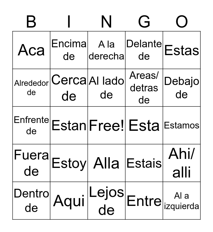 This bingo card has a free space and 24 words: Estoy, Aqui, Al lado de, Dentro de, Estas, Aca, Alrededor de, Encima de, Esta, Alla, Areas/ detras de, Enfrente de, Estais, Ahi/ alli, Cerca de, Entre, Estamos, A la derecha, Debajo de, Estan, Al a izquierda, Fuera de, Delante de and Lejos de.