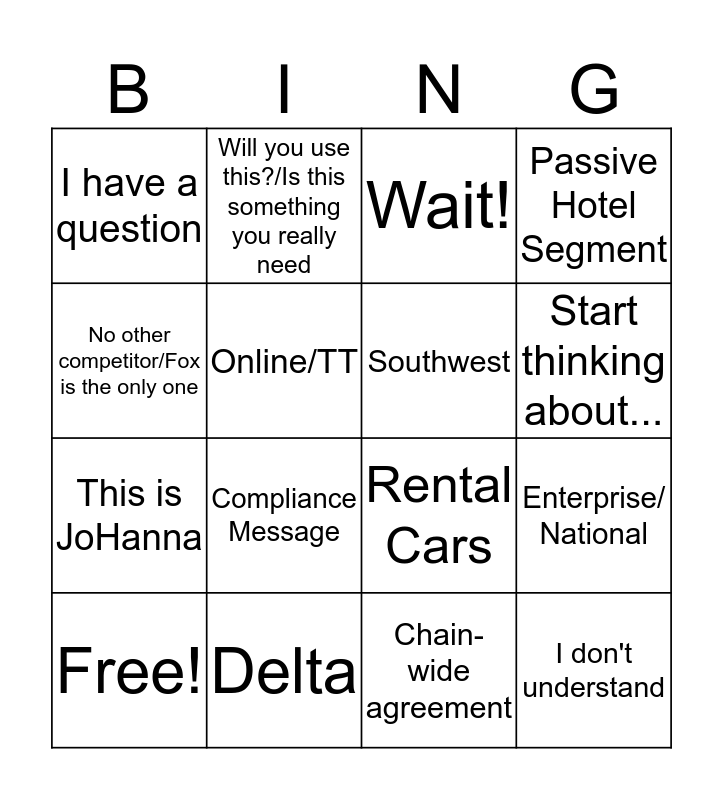 This bingo card has 16 words: Delta, Enterprise/ National, Wait!, I have a question, This is JoHanna, Will you use this?/Is this something you really need, Rental Cars, Chain-wide agreement, No other competitor/Fox is the only one, Online/TT, Free!, Passive Hotel Segment, Compliance Message, Start thinking about..., Southwest and I don't understand.