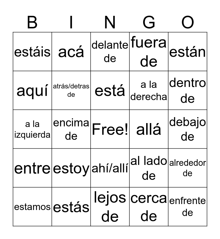 This bingo card has a free space and 24 words: estoy, estás, está, estamos, están, estáis, aquí, acá, allá, ahí/allí, a la derecha, a la izquierda, al lado de, alrededor de, atrás/detras de, cerca de, debajo de, delante de, dentro de, encima de, enfrente de, entre, fuera de and lejos de.