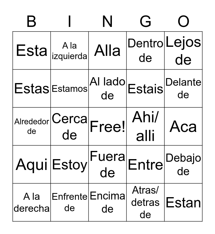 This bingo card has a free space and 24 words: Estoy, Enfrente de, Al lado de, A la derecha, Lejos de, Esta, Estas, A la izquierda, Ahi/ alli, Fuera de, Estais, Alrededor de, Entre, Debajo de, Estamos, Atras/ detras de, Aca, Alla, Delante de, Cerca de, Estan, Aqui, Dentro de and Encima de.