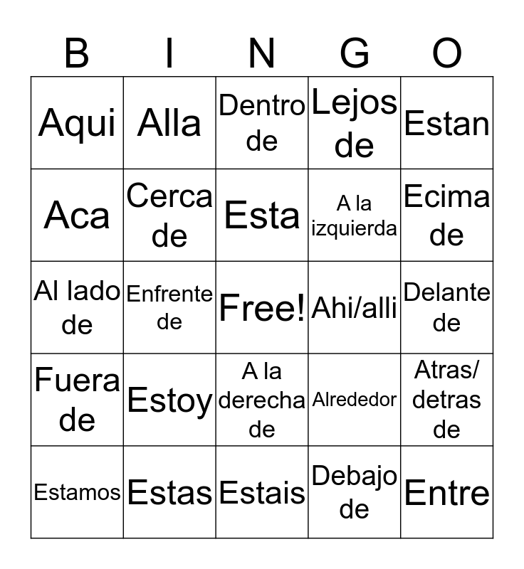 This bingo card has a free space and 24 words: Estoy, Estas, Esta, Estamos, Estan, Aqui, Aca, Alla, Ahi/alli, A la derecha de, A la izquierda, Al lado de, Alrededor, Atras/ detras de, Cerca de, Debajo de, Delante de, Dentro de, Ecima de, Enfrente de, Entre, Fuera de, Lejos de and Estais.