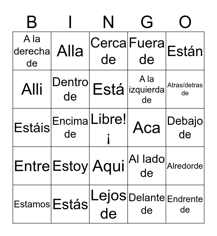 This bingo card has a free space and 24 words: Estoy, Estás, Está, Estamos, Están, A la derecha de, Alli, Alla, Aca, Aqui, A la izquierda de, Estáis, Al lado de, Alredorde, Dentro de, Delante de, Debajo de, Cerca de, Atras/detras de, Encima de, Endrente de, Entre, Fuera de and Lejos de.