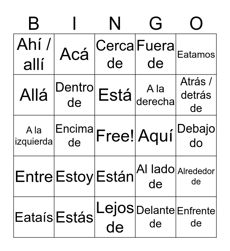 This bingo card has a free space and 24 words: Estoy, Estás, Está, Eataís, Eatamos, Ahí / allí, Allá, Acá, Aquí, Están, A la derecha, A la izquierda, Al lado de, Alrededor de, Dentro de, Delante de, Debajo do, Cerca de, Atrás / detrás de, Encima de, Enfrente de, Entre, Fuera de and Lejos de.