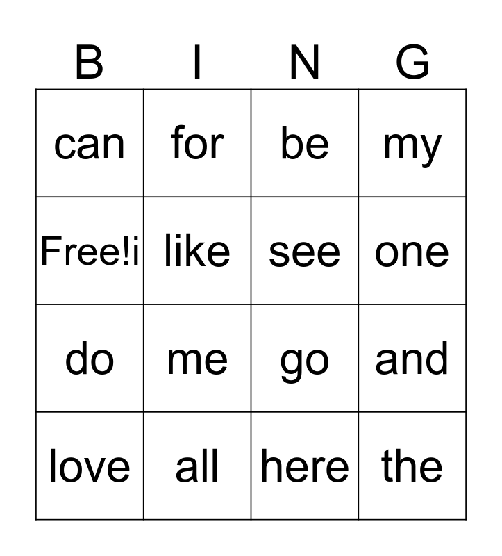 This bingo card has 16 words: all, and, be, can, do, for, go, here, Free!i, like, love, my, me, one, see and the.