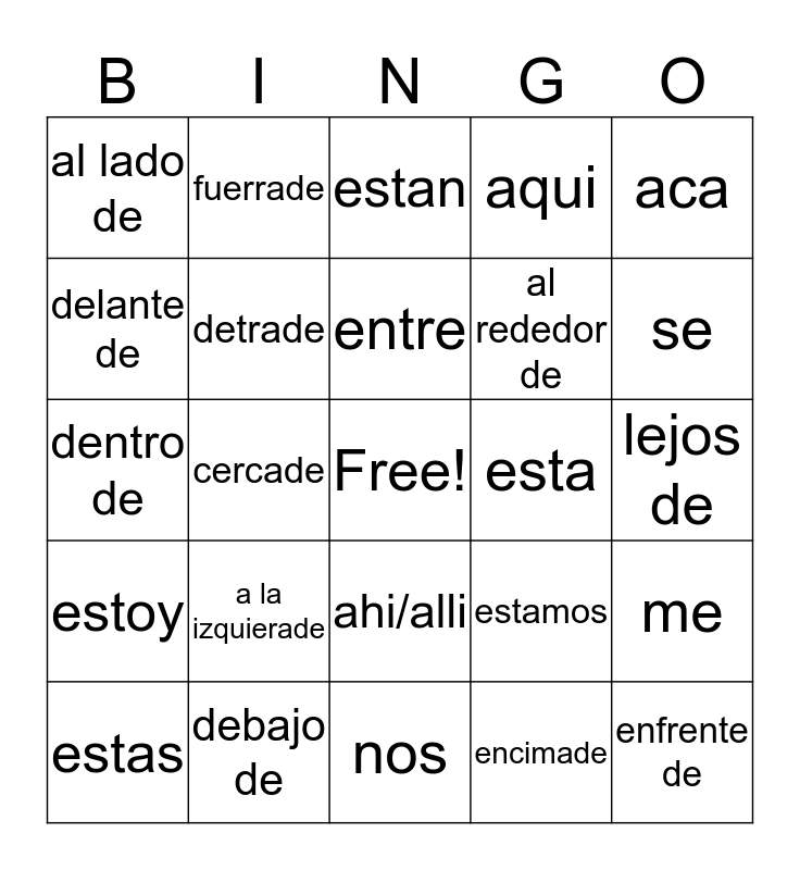 This bingo card has a free space and 24 words: a la izquierade, debajo de, entre, estas, aca, al lado de, delante de, fuerrade, esta, ahi/alli, al rededor de, dentro de, estamos, me, detrade, encimade, lejos de, estan, se, cercade, enfrente de, estoy, aqui and nos.