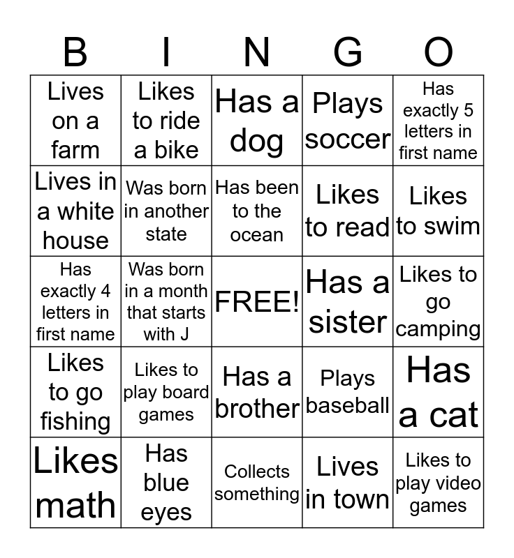 This bingo card has a free space and 24 words: Likes to play board games, Has blue eyes, Has been to the ocean, Likes math, Has exactly 5 letters in first name, Lives on a farm, Lives in a white house, Likes to ride a bike, Has a sister, Has a brother, Likes to read, Has exactly 4 letters in first name, Plays baseball, Has a cat, Was born in another state, Lives in town, Likes to go camping, Has a dog, Likes to swim, Was born in a month that starts with J, Likes to play video games, Likes to go fishing, Plays soccer and Collects something.