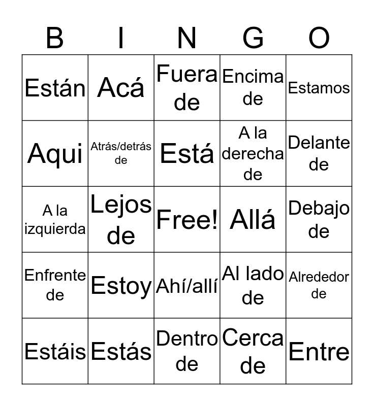 This bingo card has a free space and 24 words: Estoy, Estás, Está, Estáis, Estamos, Están, Aqui, Acá, Allá, Ahí/allí, A la derecha de, A la izquierda, Al lado de, Alrededor de, Atrás/detrás de, Cerca de, Debajo de, Fuera de, Delante de, Lejos de, Entre, Enfrente de, Encima de and Dentro de.