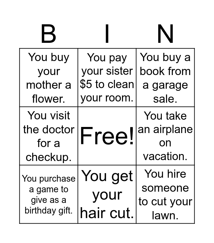 This bingo card has a free space and 10 words: You get your hair cut., You buy a book from a garage sale., You buy your mother a flower., You hire someone to cut your lawn., You visit the doctor for a checkup., You purchase a game to give as a birthday gift., You pay your sister $5 to clean your room., You buy an ice cream from the ice cream truck., You take an airplane on vacation. and Your brother sells you his old baseball mitt for $2..
