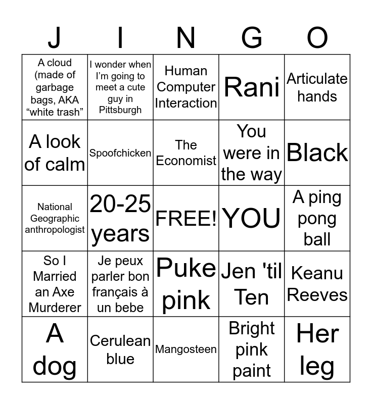 This bingo card has a free space and 24 words: Je peux parler bon français à un bebe, Cerulean blue, The Economist, A dog, Articulate hands, A cloud (made of garbage bags, AKA “white trash”, A look of calm, I wonder when I’m going to meet a cute guy in Pittsburgh, YOU, Puke pink, You were in the way, National Geographic anthropologist, Jen 'til Ten, Keanu Reeves, Spoofchicken, Bright pink paint, A ping pong ball, Human Computer Interaction, Black, 20-25 years, Her leg, So I Married an Axe Murderer, Rani and Mangosteen.
