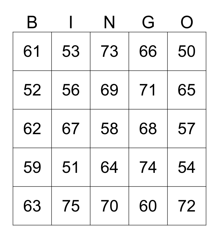 This bingo card has 25 words: 51, 70, 69, 63, 50, 61, 52, 53, 68, 64, 71, 62, 74, 54, 56, 72, 57, 73, 65, 67, 58, 75, 59, 66 and 60.