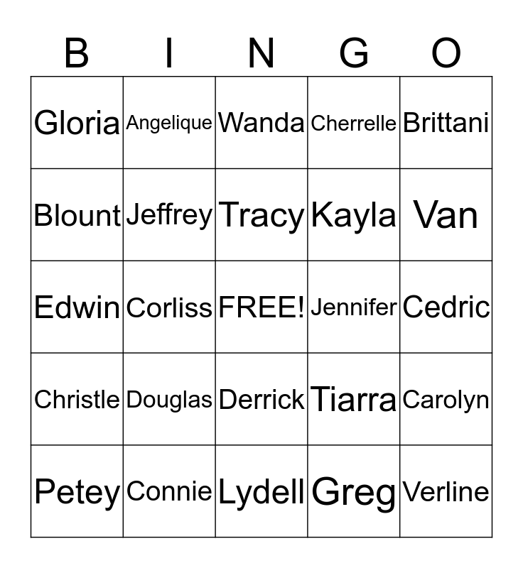 This bingo card has a free space and 24 words: Douglas, Connie, Tracy, Petey, Brittani, Gloria, Blount, Angelique, Jennifer, Derrick, Kayla, Edwin, Tiarra, Carolyn, Jeffrey, Greg, Cedric, Wanda, Van, Corliss, Verline, Christle, Cherrelle and Lydell.