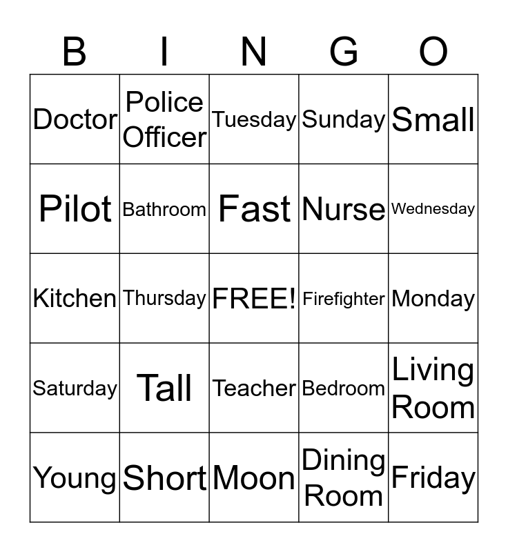This bingo card has a free space and 24 words: Tall, Short, Fast, Young, Small, Doctor, Pilot, Police Officer, Firefighter, Teacher, Nurse, Kitchen, Bedroom, Living Room, Bathroom, Dining Room, Monday, Tuesday, Wednesday, Thursday, Friday, Saturday, Sunday and Moon.