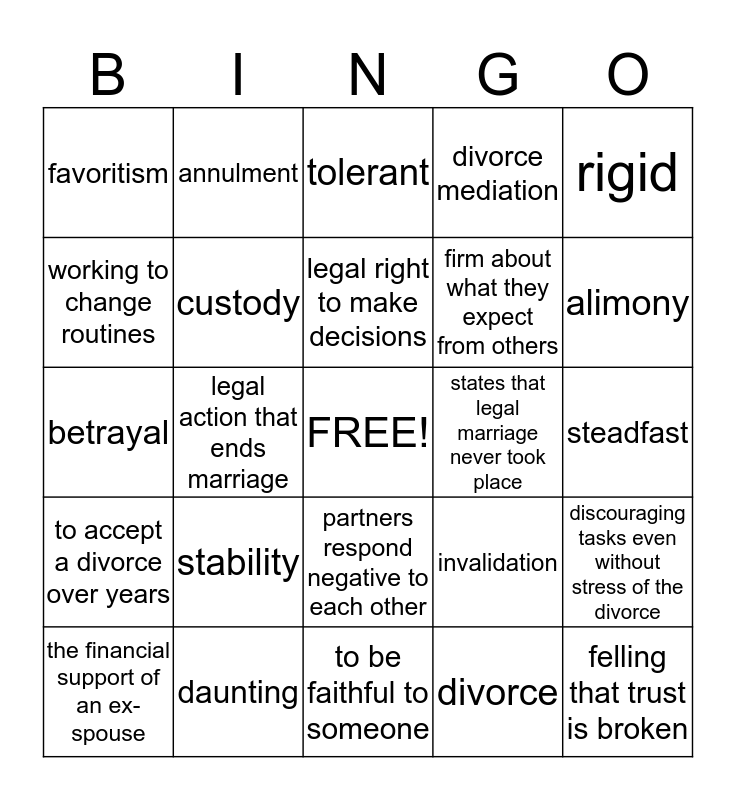 This bingo card has a free space and 24 words: stability, daunting, legal right to make decisions, the financial support of an ex-spouse, rigid, favoritism, working to change routines, annulment, states that legal marriage never took place, partners respond negative to each other, firm about what they expect from others, betrayal, invalidation, discouraging tasks even without stress of the divorce, custody, divorce, steadfast, tolerant, alimony, legal action that ends marriage, felling that trust is broken, to accept a divorce over years, divorce mediation and to be faithful to someone.