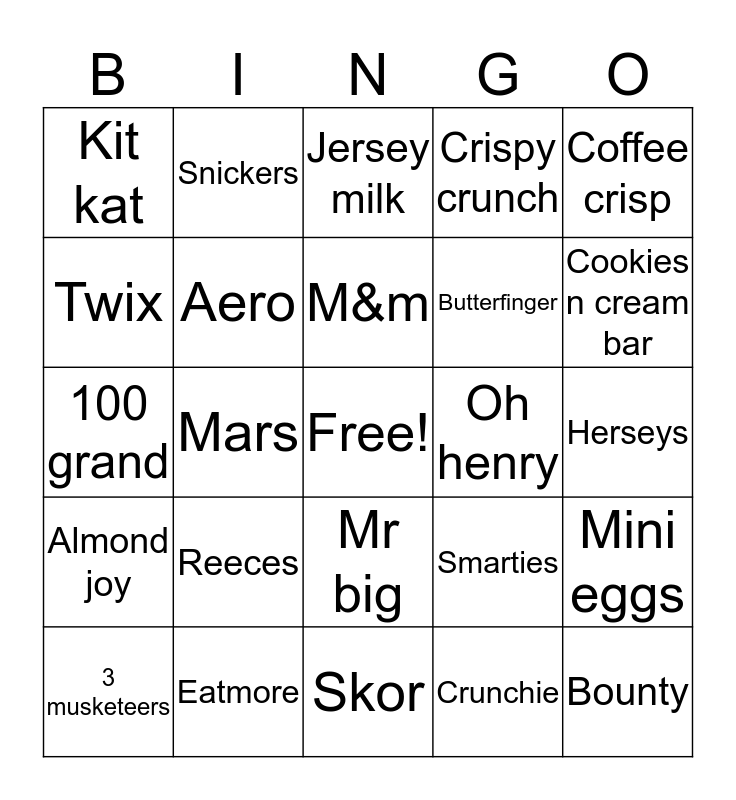 This bingo card has a free space and 24 words: Reeces, Eatmore, M&m, 3 musketeers, Coffee crisp, Kit kat, Twix, Snickers, Oh henry, Mr big, Butterfinger, 100 grand, Smarties, Mini eggs, Aero, Crunchie, Herseys, Jersey milk, Cookies n cream bar, Mars, Bounty, Almond joy, Crispy crunch and Skor.