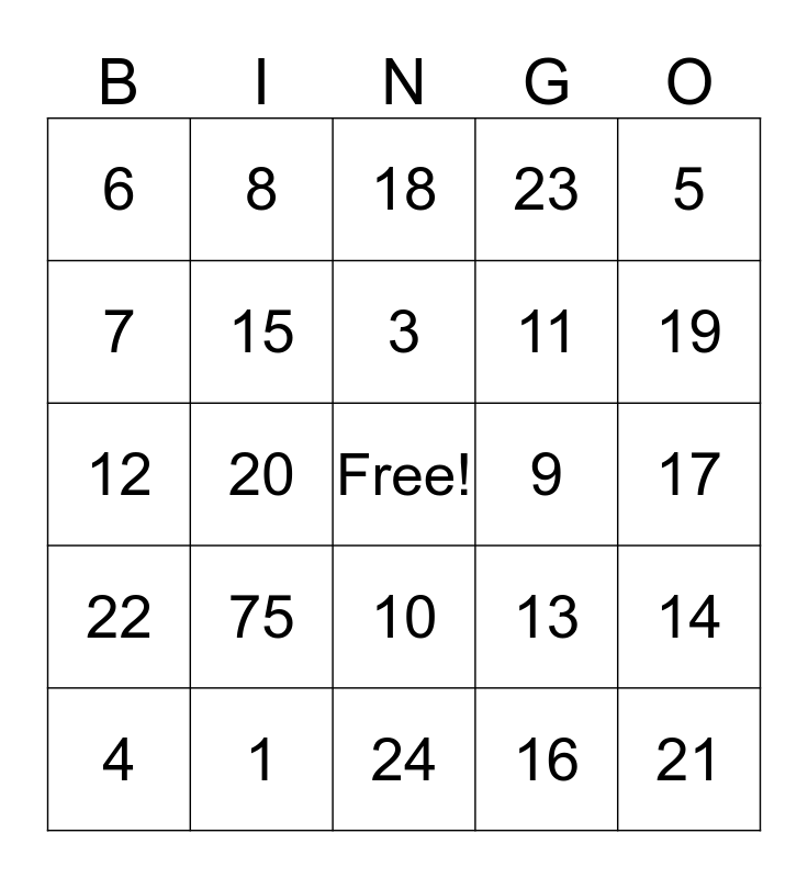 This bingo card has a free space and 24 words: 75, 1, 3, 4, 5, 6, 7, 8, 9, 10, 11, 12, 13, 14, 15, 16, 17, 18, 19, 20, 21, 22, 23 and 24.