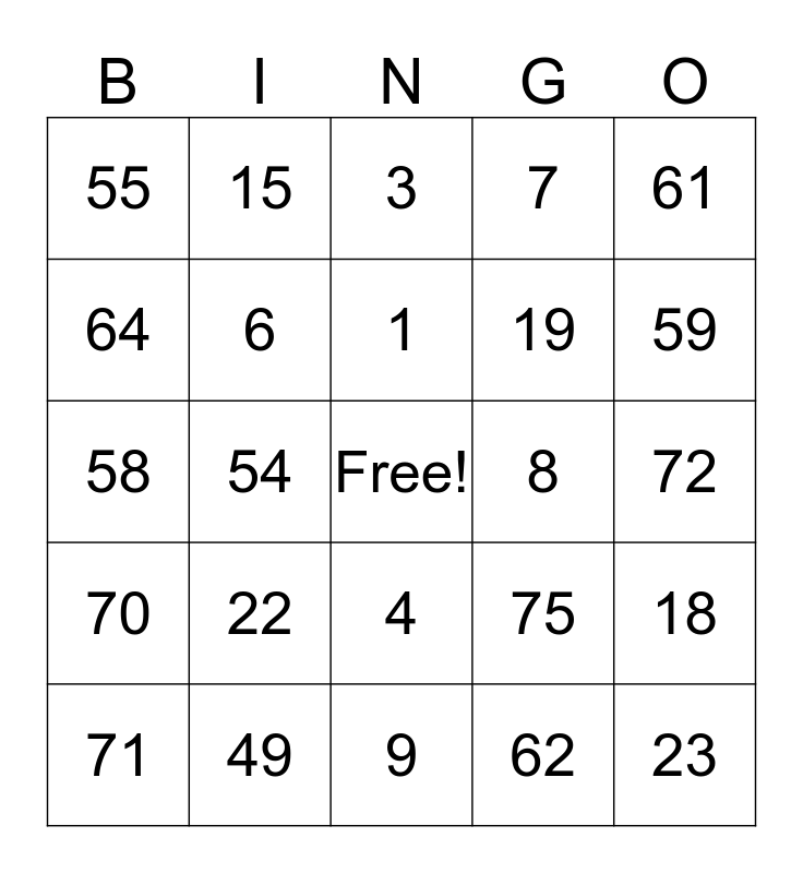 This bingo card has a free space and 24 words: 22, 49, 1, 71, 61, 55, 64, 15, 8, 4, 19, 58, 75, 18, 6, 62, 72, 3, 59, 54, 23, 70, 7 and 9.