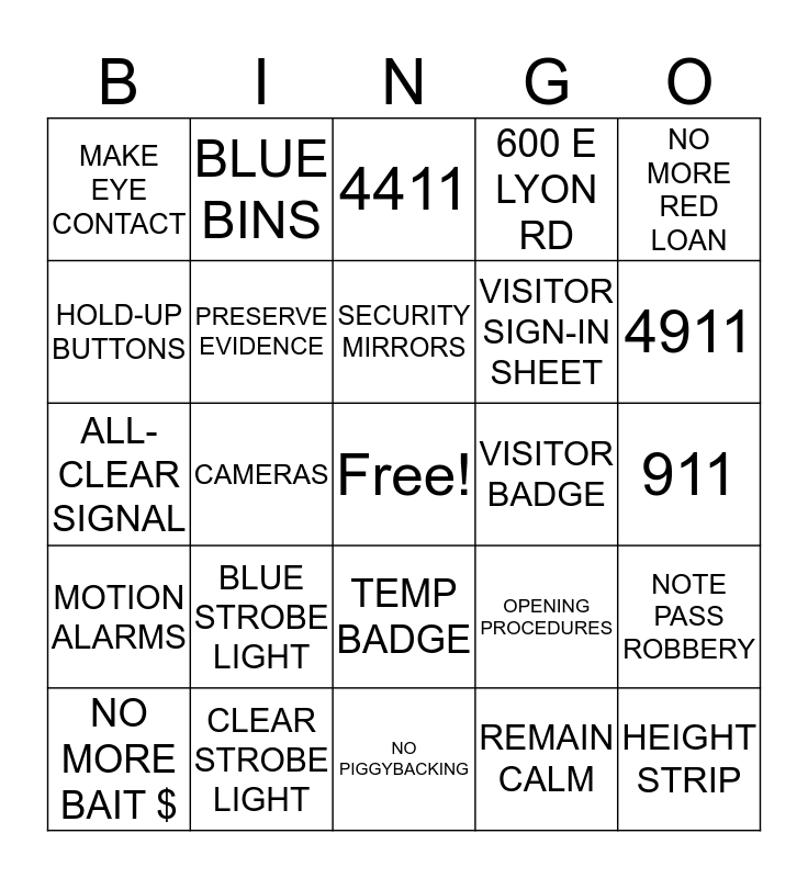 This bingo card has a free space and 24 words: BLUE STROBE LIGHT, CLEAR STROBE LIGHT, SECURITY MIRRORS, NO MORE BAIT $, NO MORE RED LOAN, MAKE EYE CONTACT, HOLD-UP BUTTONS, BLUE BINS, VISITOR BADGE, TEMP BADGE, VISITOR SIGN-IN SHEET, ALL-CLEAR SIGNAL, OPENING PROCEDURES, NOTE PASS ROBBERY, PRESERVE EVIDENCE, REMAIN CALM, 911, 4411, 4911, CAMERAS, HEIGHT STRIP, MOTION ALARMS, 600 E LYON RD and NO PIGGYBACKING.