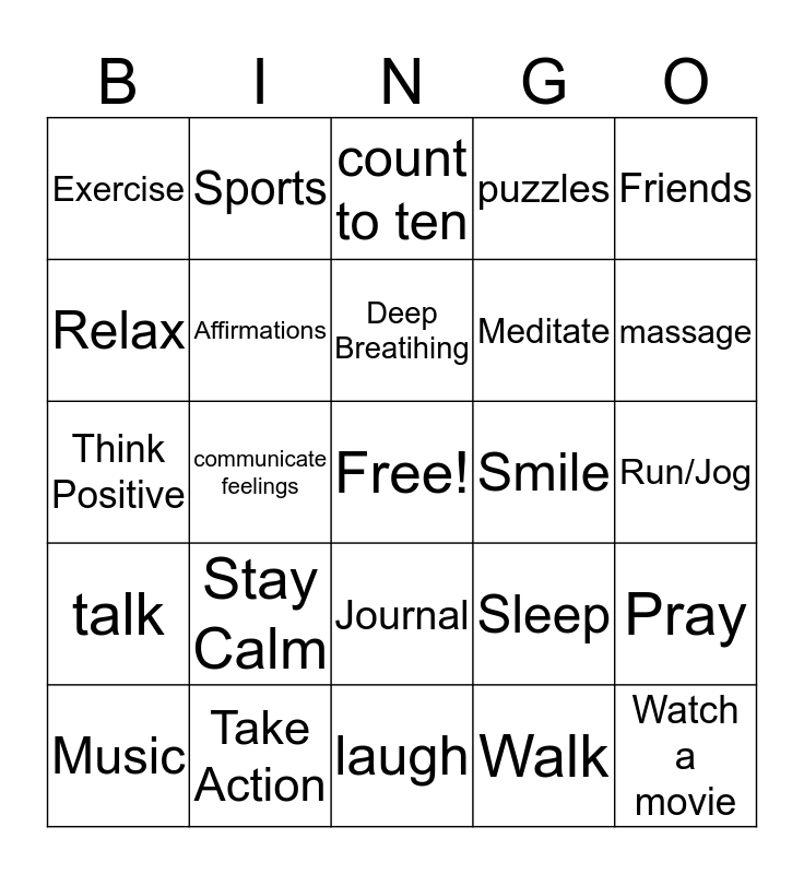This bingo card has a free space and 24 words: Stay Calm, Take Action, Deep Breatihing, Music, Friends, Exercise, Relax, Sports, Smile, Journal, Meditate, Think Positive, Sleep, Pray, Affirmations, Walk, Run/Jog, count to ten, massage, communicate feelings, Watch a movie, talk, puzzles and laugh.