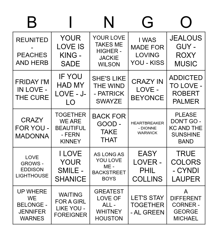 This bingo card has 50 words: EMOTIONS - SAMANTHA SANG, BACK FOR GOOD - TAKE THAT, I DON'T WANT TO MISS A THING - AEROSMITH, GREATEST LOVE OF ALL - WHITNEY HOUSTON, I LOVE YOUR SMILE - SHANICE, KEEP ON LOVING YOU - REO SPEEDWAGON, YOUR LOVE IS KING - SADE, CAN'T TAKE MY EYES OFF YOU - ANDY WILLIAMS, FRIDAY I'M IN LOVE - THE CURE, LOVEFOOL - CARDIGANS, IF YOU HAD MY LOVE - J-LO, I WAS MADE FOR LOVING YOU - KISS, TRUE COLORS - CYNDI LAUPER, EASY LOVER - PHIL COLLINS, TORN - NATALIE IMBRUGLIA, MAGIC MOMENTS - PERRY COMO, SHE'S LIKE THE WIND - PATRICK SWAYZE, HEARTBREAKER - DIONNE WARWICK, HEART SHAPED BOX - NIRVANA, JEALOUS GUY - ROXY MUSIC, TOGETHER WE ARE BEAUTIFUL - FERN KINNEY, LET'S STAY TOGETHER - AL GREEN, REUNITED - PEACHES AND HERB, CRAZY IN LOVE - BEYONCE, YOU'VE GOT TO HIDE YOUR LOVE - BEATLES, A DIFFERENT CORNER - GEORGE MICHAEL, ADDICTED TO LOVE - ROBERT PALMER, HOW 'BOUT US - CHAMPAIGN, YOUR LOVE TAKES ME HIGHER - JACKIE WILSON, AS LONG AS YOU LOVE ME - BACKSTREET BOYS, SEXUAL HEALING - MARVIN GAYE, IS THIS LOVE - ALISON MOYET, CAN'T FIGHT THIS FEELING - REO SPEEDWAGON, MY BABY JUST CARES FOR ME - NINA SIMONE, WAITING FOR A GIRL LIKE YOU - FOREIGNER, CRAZY LITTLE THING CALLED LOVE - QUEEN, I'LL DO ANYTHING FOR LOVE - MEATLOAF, JUST THE WAY YOU ARE - BARRY WHITE, I'VE NEVER BEEN TO ME - CHARLENE, PLEASE DON'T GO - KC AND THE SUNSHINE BAND, EVERY BREATH YOU TAKE - POLICE, I JUST CALLED TO SAY - STEVIE WONDER, WOMAN IN LOVE - BARBRA STRAISAND, LOVE BITES - DEF LEOPARD, UP WHERE WE BELONGE - JENNIFER WARNES, CRAZY FOR YOU - MADONNA, LISTEN TO YOUR HEART - ROXETTE, ALL OUT OF LOVE - AIR SUPPLY, LOVE GROWS - EDDISON LIGHTHOUSE and I THINK I LOVE YOU - PARTRIDGE FAMILY.