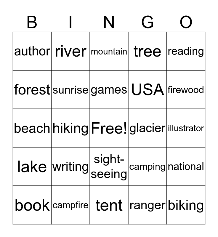 This bingo card has a free space and 27 words: camping, Nevada, USA, tent, forest, mountain, river, lake, glacier, national, beach, tree, book, campfire, firewood, sunset, sunrise, games, writing, author, illustrator, ranger, hiking, biking, sight-seeing, reading and tourist.