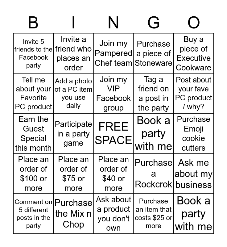 This bingo card has a free space and 24 words: Place an order of $75 or more, Purchase the Mix n Chop, Join my VIP Facebook group, Comment on 5 different posts in the party, Buy a piece of Executive Cookware, Invite 5 friends to the Facebook party, Tell me about your Favorite PC product, Invite a friend who places an order, Book a party with me, Place an order of $40 or more, Tag a friend on a post in the party, Earn the Guest Special this month, Purchase a Rockcrok, Ask me about my business, Add a photo of a PC item you use daily, Purchase an item that costs $25 or more, Purchase Emoji cookie cutters, Join my Pampered Chef team, Post about your fave PC product / why?, Participate in a party game, Book a party with me, Place an order of $100 or more, Purchase a piece of Stoneware and Ask about a product you don't own.