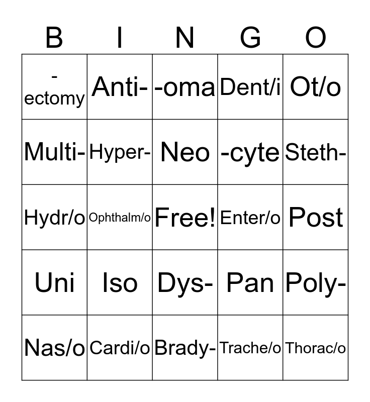 This bingo card has a free space and 24 words: Iso, Cardi/o, Neo, Nas/o, Ot/o, -ectomy, Multi-, Anti-, Enter/o, Dys-, -cyte, Hydr/o, Pan, Poly-, Hyper-, Trache/o, Post, -oma, Steth-, Ophthalm/o, Thorac/o, Uni, Dent/i and Brady-.
