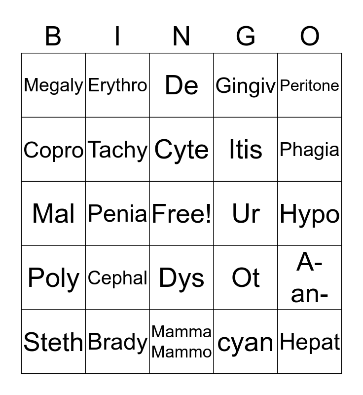 This bingo card has a free space and 24 words: Cephal, Brady, Cyte, Steth, Peritone, Megaly, Copro, Erythro, Ur, Dys, Itis, Mal, Ot, A- an-, Tachy, cyan, Hypo, De, Phagia, Penia, Hepat, Poly, Gingiv and Mamma Mammo.