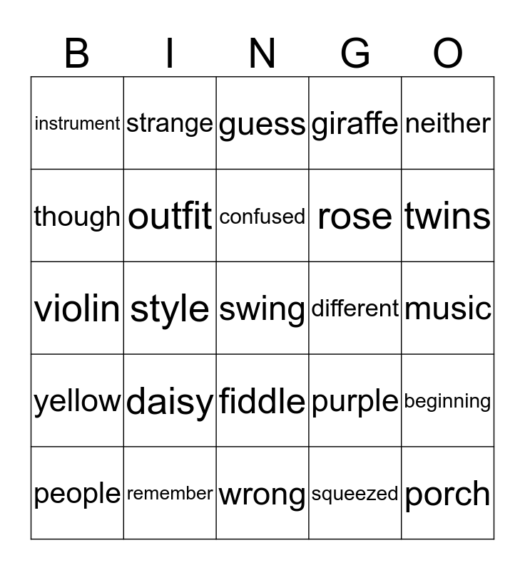 This bingo card has 25 words: daisy, wrong, confused, people, neither, instrument, though, strange, different, fiddle, rose, violin, purple, beginning, outfit, porch, music, guess, twins, style, swing, remember, yellow, giraffe and squeezed.