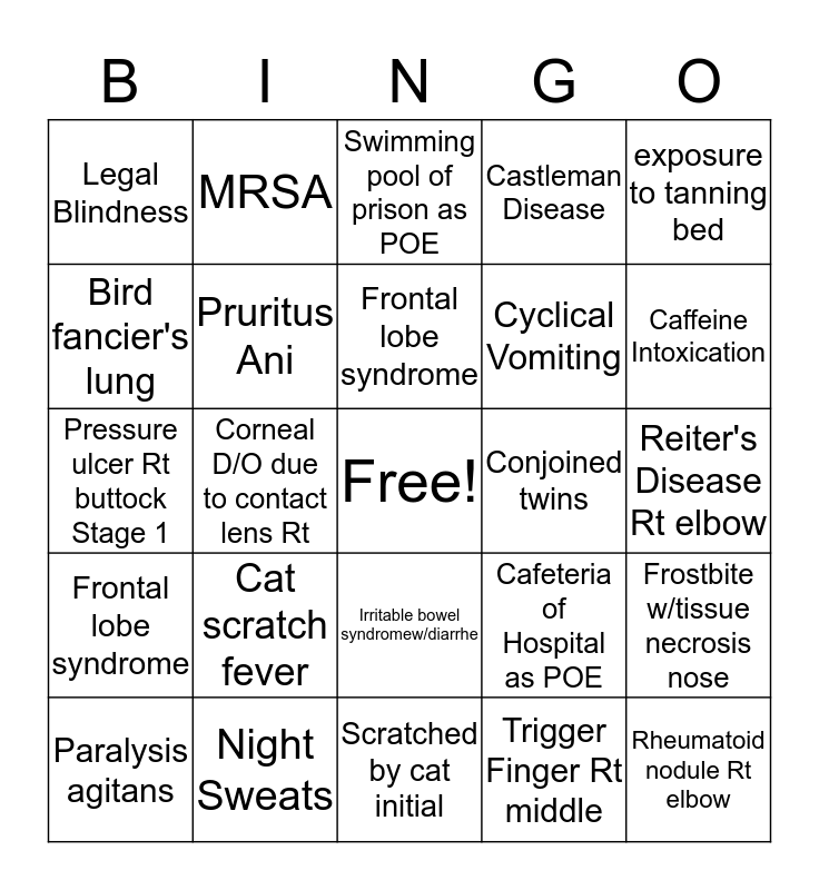 This bingo card has a free space and 24 words: Cat scratch fever, Night Sweats, Frontal lobe syndrome, Paralysis agitans, exposure to tanning bed, Legal Blindness, Bird fancier's lung, MRSA, Conjoined twins, Irritable bowel syndromew/diarrhe, Cyclical Vomiting, Pressure ulcer Rt buttock Stage 1, Cafeteria of Hospital as POE, Frostbite w/tissue necrosis nose, Pruritus Ani, Trigger Finger Rt middle, Reiter's Disease Rt elbow, Swimming pool of prison as POE, Caffeine Intoxication, Corneal D/O due to contact lens Rt, Rheumatoid nodule Rt elbow, Frontal lobe syndrome, Castleman Disease and Scratched by cat initial.