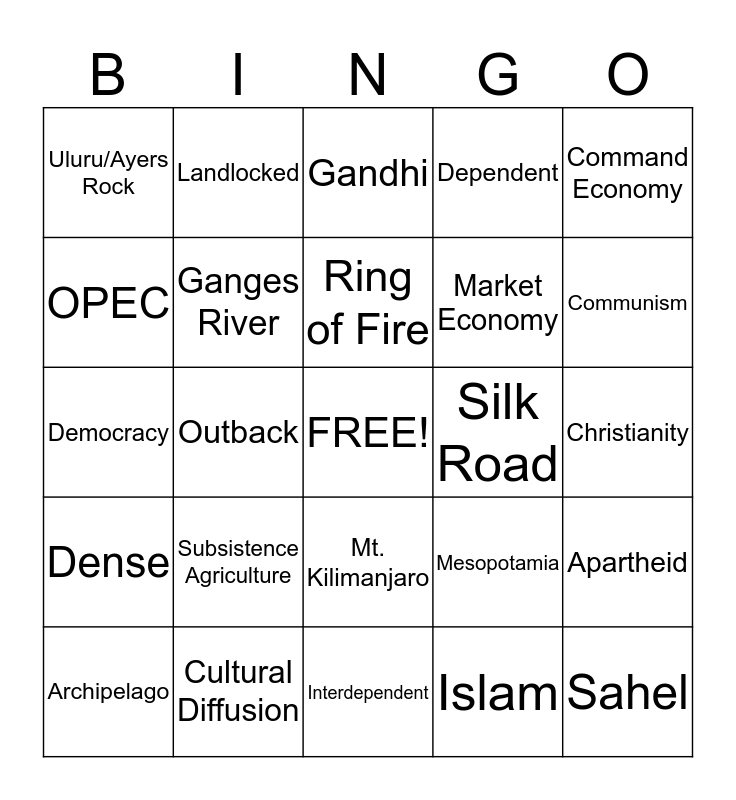 This bingo card has a free space and 24 words: Subsistence Agriculture, Cultural Diffusion, Ring of Fire, Archipelago, Command Economy, Uluru/Ayers Rock, OPEC, Landlocked, Silk Road, Mt. Kilimanjaro, Market Economy, Democracy, Mesopotamia, Apartheid, Ganges River, Islam, Christianity, Gandhi, Communism, Outback, Sahel, Dense, Dependent and Interdependent.