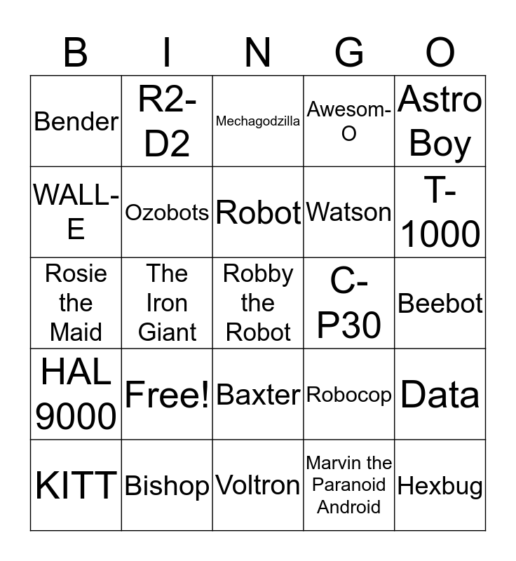 This bingo card has 25 words: Free!, Voltron, Robot, KITT, Astro Boy, Bender, WALL-E, R2-D2, C-P30, Baxter, Watson, Rosie the Maid, Robocop, Data, Ozobots, Hexbug, Beebot, Mechagodzilla, T-1000, The Iron Giant, Robby the Robot, Bishop, HAL 9000, Awesom-O and Marvin the Paranoid Android.