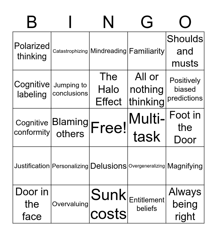 This bingo card has a free space and 24 words: Personalizing, Overvaluing, The Halo Effect, Door in the face, Shoulds and musts, Polarized thinking, Cognitive labeling, Catastrophizing, Multi-task, Delusions, All or nothing thinking, Cognitive conformity, Overgeneralizing, Magnifying, Jumping to conclusions, Entitlement beliefs, Foot in the Door, Mindreading, Positively biased predictions, Blaming others, Always being right, Justification, Familiarity and Sunk costs.