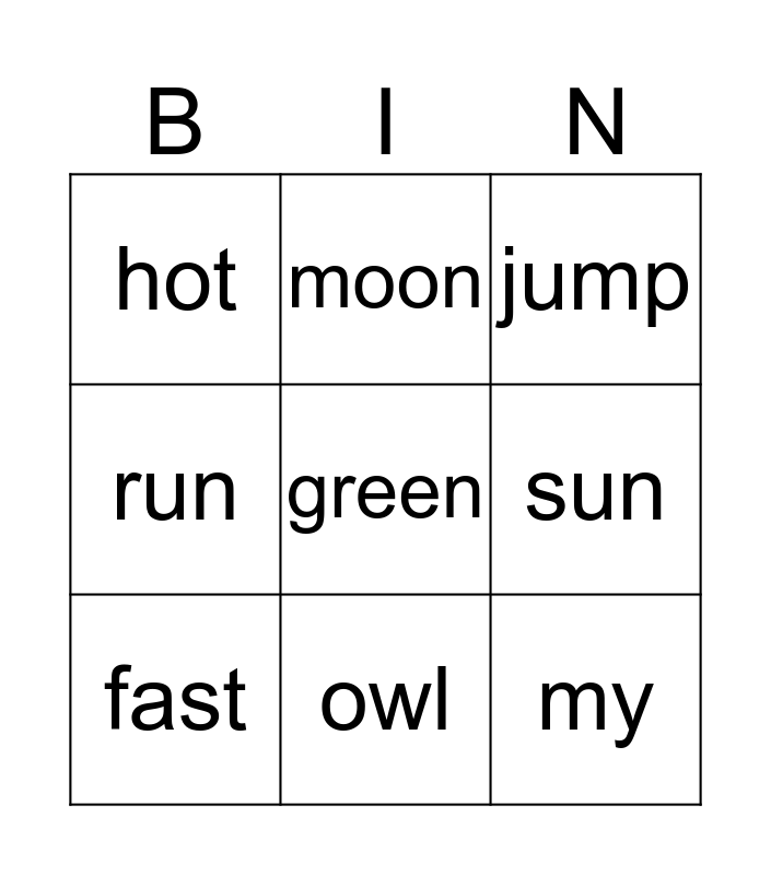 This bingo card has 9 words: fast, jump, moon, run, hot, sun, green, my and owl.