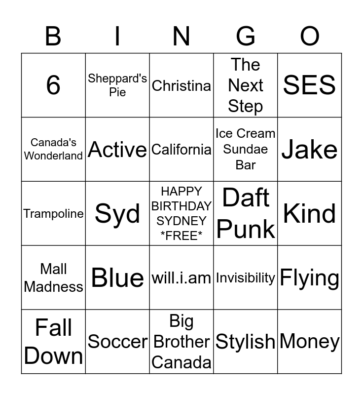 This bingo card has a free space and 24 words: Blue, Soccer, California, Fall Down, SES, 6, Canada's Wonderland, Sheppard's Pie, Daft Punk, will.i.am, Ice Cream Sundae Bar, Trampoline, Invisibility, Flying, Active, Stylish, Kind, Christina, Jake, Syd, Money, Mall Madness, The Next Step and Big Brother Canada.